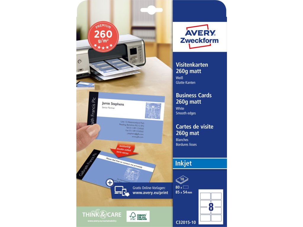 Vizitkový papír | pro Inkjet | Avery Zweckform C32015-10 + online software pro tisk vizitek + tisková šablona ke stažení zdarma