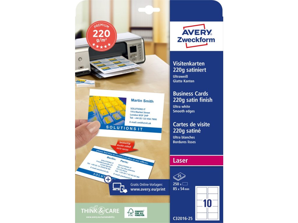 Vizitkový papír Avery Zweckform C32016-25 o rozměru 85 x 54 mm a gramáži 220 Tyto vizitky z kvalitního satinovaného bílého kartonu působí reprezentativně při osobních schůzkách, veletrzích i firemních akcích. Výhodou je okamžitá dostupnost – vytisknete si přesně tolik kusů, kolik právě potřebujete. Vizitky jsou oboustranně potisknutelné, což poskytuje více prostoru pro doplňující informace, jako je logo, QR kód, mapa či firemní slogan. Díky patentované technologii Quick&Clean™ mají dokonale hladké a ostré hrany bez mikroperforace. V naší nabídce naleznete také další gramáže vizitkových papírů Avery Zweckform pro různé tiskové technologie.