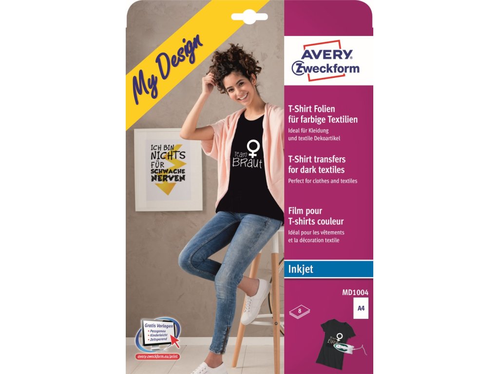 Nažehlovací přenosové fólie Avery Zweckform MD1004 jsou určeny pro všechny tmavé a barevné bavlněné textilie. Jsou ideální pro tvorbu originálních triček, polštářů, zástěr, ubrusů či dětského oblečení. Stačí si vybrat fotku, text nebo obrázek, případně vytvořit vlastní návrh v počítači a vytisknout jej na běžné inkoustové tiskárně. Motiv stačí jednoduše zažehlit na textil – potisk je odolný vydrží až 20 praní při teplotě 30 °C. Tyto fólie se často označují také jako přenosový papír na textil nebo žehlicí papír pro Inkjet tiskárny.
